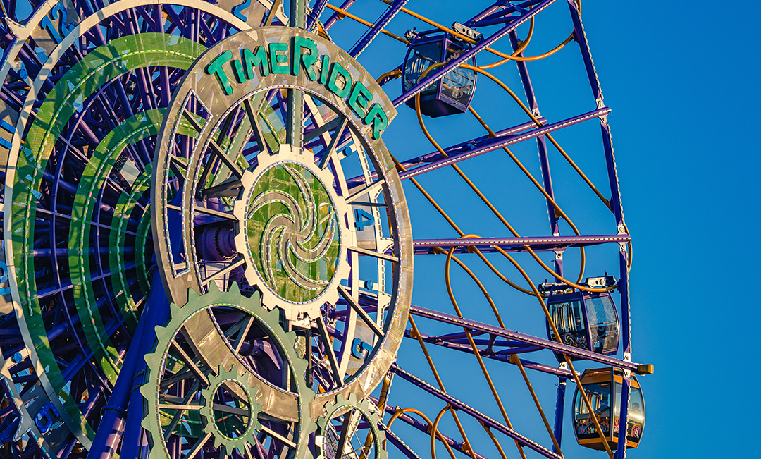 Passengers enter the queue at ground level and choose their destiny: the line for Time Keepers, the fixed cabins offering a more traditional Ferris wheel experience, or the line for Time Travellers, the swinging cabins which move along an oblong-shaped coaster track, rising and falling with gravity as the wheel turns! After choosing, guests ascend to board the ride at the roof of the queue building. The cabins are embellished with distinct colours and graphics, and dazzling lighting design highlights the moving gears of the giant clock-like wheel.