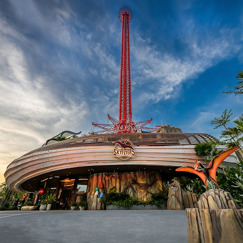 The Time Rider Coaster Wheel is a stand-alone attraction that features 24 suspended cabins, 16 swinging and 8 fixed, with a capacity for over 1,080 passengers per hour. FORREC’s team of concept artists, graphic designers, and architectural designers worked together to create the story, ride and vehicle theming, queue building, and façade for this dynamic new ride. FORREC’s creative concept revolves around the theme of time travel and a unique character named Dr. Chrono, an inventor who is attempting to unravel the mysteries of time, while is on a mission to unite the future with the past.